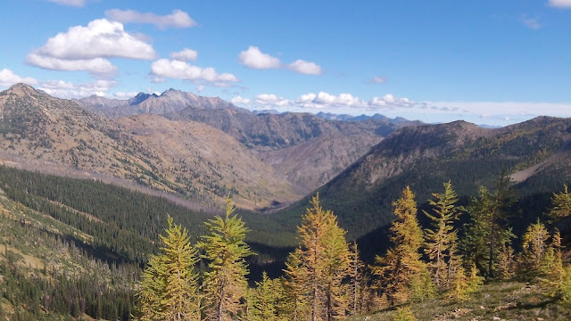 I sat on the trail, looking out at the vast landscape all around. There was a verdant valley, marked with a burned area that looked like a hedgehog of land amid the green carpet. The mountains were a gorgeous barren shade of sienna, jutting at severe angles. Above in the sky, puffy clouds hung about.